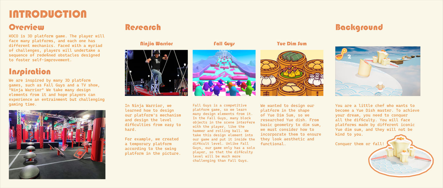 KOCO is 3D platform game. The player will face many platforms, and each one has different mechanics. As the designer, my goal for Koco is to guide players through an unforgettable gaming odyssey. Faced with a myriad of challenges, players will undertake a sequence of redefined obstacles designed to foster self-improvement.
